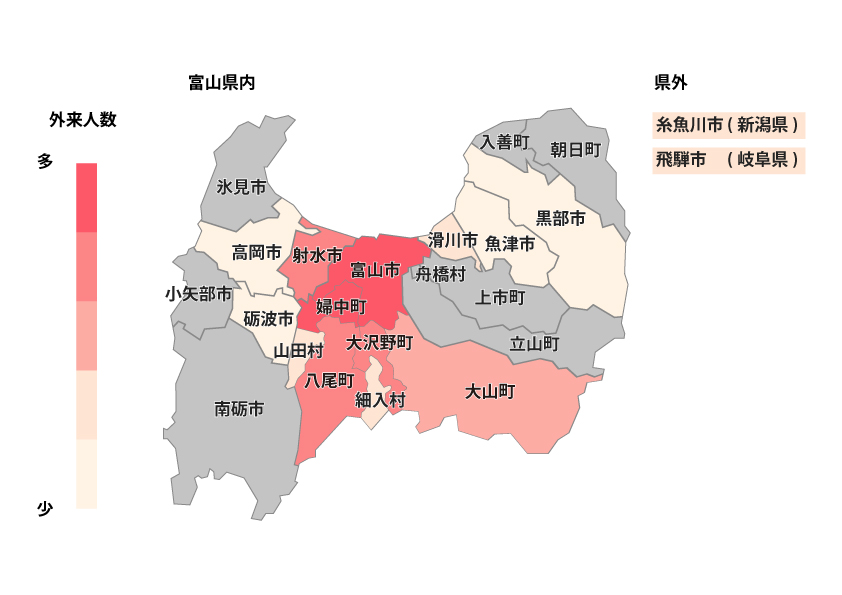 富山市を中心に、婦中町・八尾町・射水市をはじめ県内各地域、さらに新潟県糸魚川市や岐阜県飛騨市など、幅広い地域からの外来患者さんのリハビリテーションを支援しています。