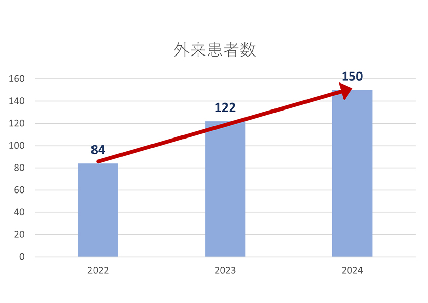 近年、外来患者さんの数は着実に増加しています。一人ひとりの状態にわせた質の高いリハビリテーションを通じて、みなさまの健康と生活の支援に努めてまいります。
