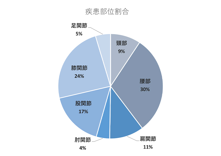 関節疾患においては、腰や膝だけでなく、肩や頸部、足関節・肘関節にいたるまで、あらゆる関節部位の疾患に対する外来リハビリテーションを行っています。
